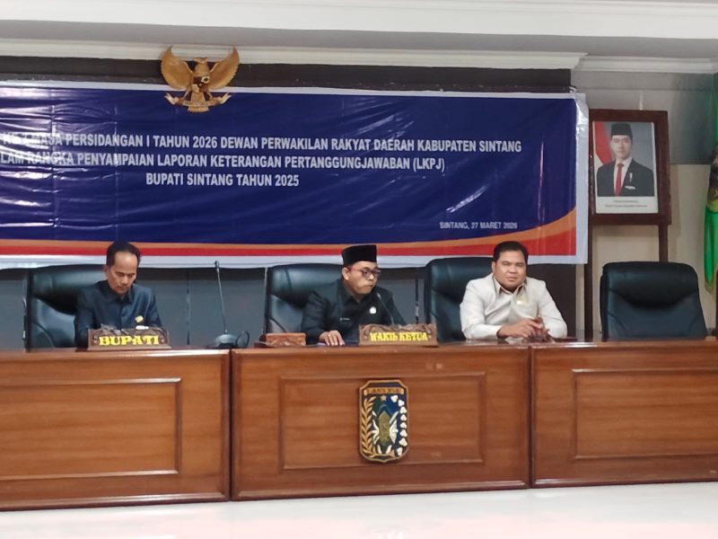 SINTANG, MMS – Dewan Perwakilan Rakyat Daerah (DPRD) Kabupaten Sintang menggelar Rapat Paripurna ke-7 Masa Persidangan I Tahun 2026 pada Jumat, 27 Maret 2026. Agenda utama rapat tersebut adalah penyampaian Laporan Keterangan Pertanggungjawaban (LKPj) Bupati Sintang Tahun Anggaran 2025. Kegiatan ini dilaksanakan secara resmi di gedung DPRD Kabupaten Sintang dan berlangsung dengan suasana khidmat.